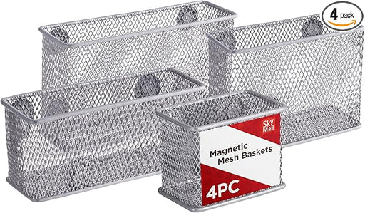 Strong magnetic backing keeps these silver steel mesh baskets handy on a fridge or file cabinet. Set of 4 fun and functional baskets includes: 4 si...