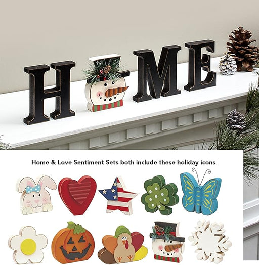 13-piece wood decorative seasonal home sign. 10 different seasonal options to easily decorate for all seasons.